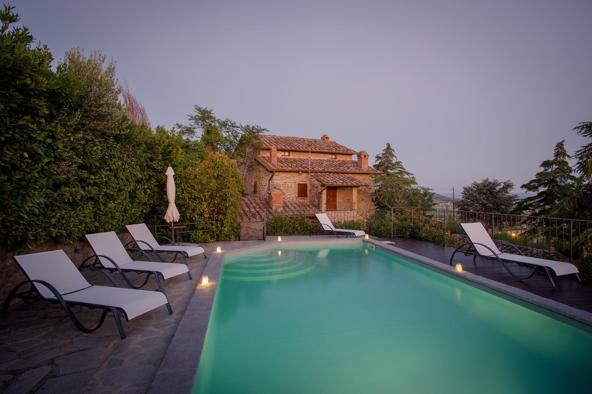 Una villa d'incanto per le vacanze più attese, riservata a famiglie gruppi di amici che decidono di condividere un'esperienza unica pur mantenendo la propria autonomia. Una dimora sospesa tra il cielo di Toscana e le colline di vigne e olivi che affacciano sulla Valdichiana: è Villa i Cocciai, a Cortona. E' dotata di dieci posti letto, quattro bagni e una piscina su una terrazza naturale con vista mozzafiato sui tramonti cortonesi e il lago Trasimeno. Villa I Cocciai si sviluppa su tre livelli; costruita in pietra è immersa in un parco con piante secolari, interamente recintata con area parcheggio per gli ospiti.