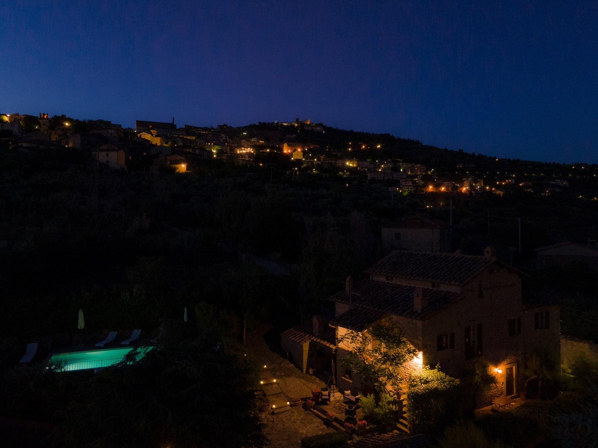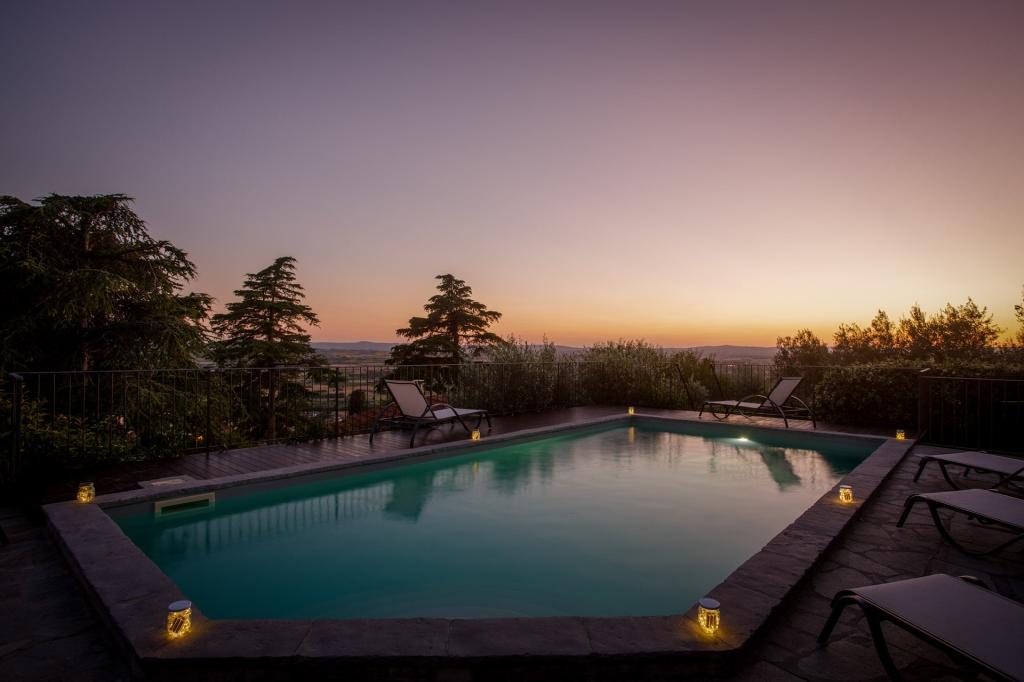 Villa I Cocciai è una nave sospesa tra oliveti, terrazzamenti, querce e lecci, che solca placida il “mare verde” della Valdichiana. Sorge a metà del colle dove la città etrusca di Cortona dispiega tutta la sua bellezza e offre una vista da sogno sulla vallata, fino a Montepulciano e a un suggestivo scorcio del lago Trasimeno, nella vicina Umbria.
